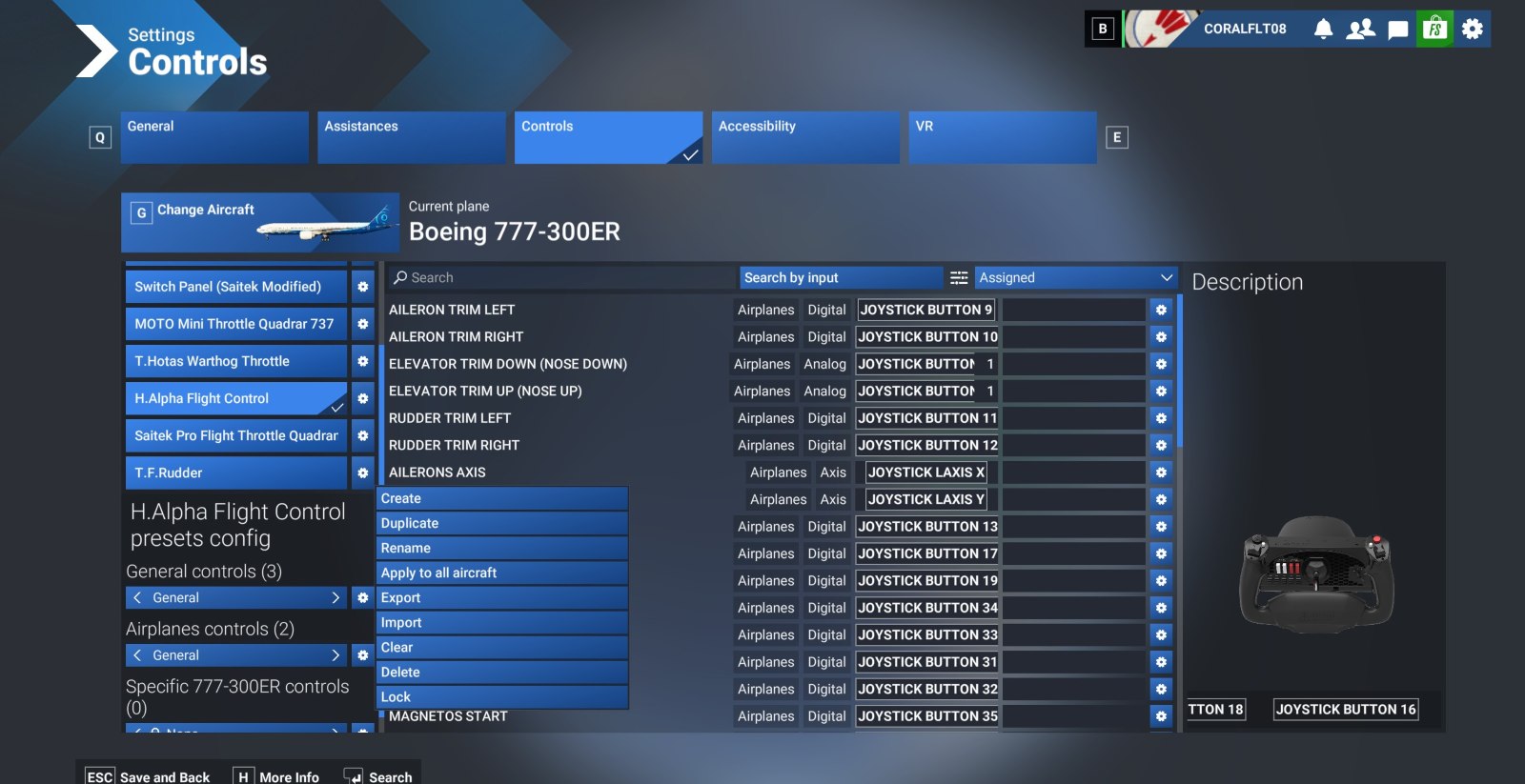 CあとはSearchで項目名を検索して空のボックスをクリックするとScanのモードになるので割当てするスイッチなりレバーを操作するとアサインされます。 これを繰り返し全てアサインできたら先程のプルダウンメニューで「Assigned」を選んで確認します。 この時各項目のキーの横に数字が表れることがありますが、これはこのキーに割当てられている重複項目の数です。一応「2」以上になっている場合は機能がバッティングしていないか右端の歯車キーをクリックして詳細を確認しましょう。 確認出来たら再度歯車マークをクリックして「Apply to all aircraft」を選択します。これで全ての機体にこのプロファイルが自動でセットされます。 なお第一階層でも複数のプロファイルの作成はできますので違う設定にしたい場合は別名で複数のプロファイルを作っても構いません。要はどれを標準プロファイルにするかだけの判断になります。