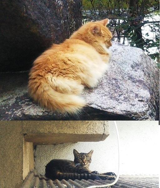 写真の上の茶色い猫は、先日お墓参りにお寺に行った時に境内にいた猫で、お供え物のお下がりでも頂いているのか、毛並みふさふさでモフモフです。参拝者に慣れているのか、人が近付いても平気です。