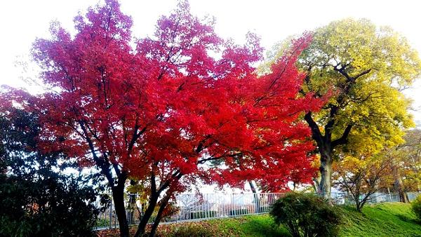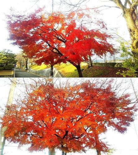写真に撮ると、後ろには黄葉した木、そして地面は草の緑と、赤、黄、緑の三色がコントラストも鮮やかです。