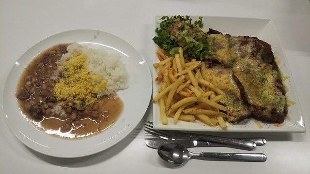 ラザニアみたいな物の上に、薄い唐揚げ風に焼いたチキンが3枚! 更にその上にチーズを置いて焼いてあります。チキン1枚だけでも、十分カフェのランチ一食分あります。それにサラダと大量のポテト付きで、ご飯は豆のソースと何だか解らないチーズっぽいふりかけを掛けて頂くのが、「ブラジル人の食べ方」だそうです。ご飯と豆ソースはお代わり自由という、とにかく量が多いメニューです。