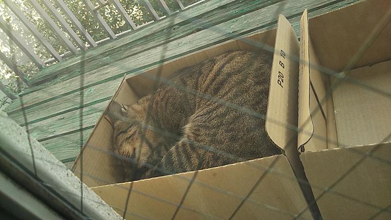 少し前にベランダで猫たちがお昼寝をしてました。これから段々風が冷たくなってきますので、少しでも暖かく気持ちよくお昼寝が出来る様にと、ベランダに段ボール箱を置いてみました。