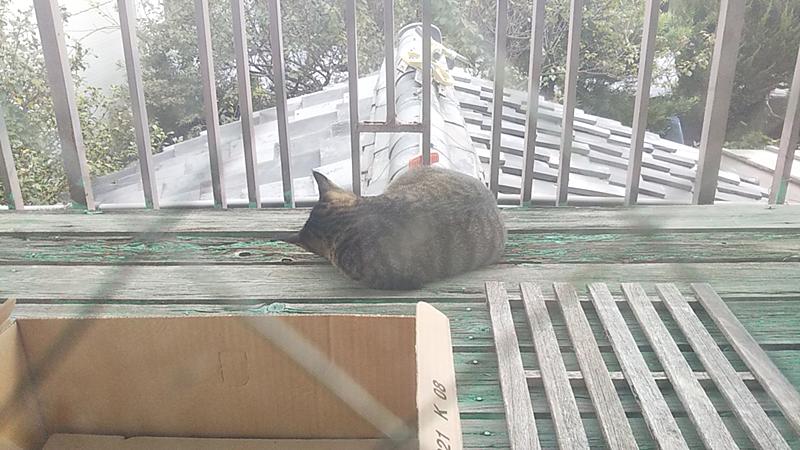 ベランダで猫が日向ぼっこしてますが、箱には入ってくれてません。この前入っていたのは主さまらしいので、入っていないのは子猫のうちのどちらかかもしれません。