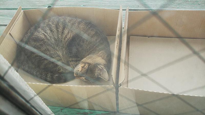 ベランダに置いた猫用の箱に、先日は主さまが入ってくれましたが、今日はたぶん子猫が入っていました。