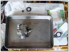 入手した部品は、こんなモノです。 パッキン・大小。オイルポンプをエンジンへつける為のガスケット。オイルポンプ自体のガスケット・・・、以上。 これがね、正直に直そうとすると、オイルポンプはアッセンブリでしか部品番号が判りません。 バラして自分で中身を交換できるなら、かなりローコストになります。 いくつかの車種でこのタイプのオイルポンプを使っているようですので、たぶん、同じ手法で直る車種があると思います。 交換は、割と簡単♪ オイルポンプはネジ2本でエンジンから外れます。オイルポンプは、ネジ4本を外せば分解可能。 っで、周りに写ってる部品を交換すれば完了♪ 細かい話しとしては取付け後のエア抜きやら調整やらがあるのですが、雨の合間に作業が終わりました。 後は走って漏れを確かめるのみ。来週ですかね。