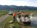 今日は、キヌヒカリという品種のお米の田植えをしました。今日の圃場はぬかるみのある田んぼがあったので、乗用田植え機と歩行田植え機を交互に使って植付けをしました。田植え作業も計画通り順調に進んでいるので嬉しいです。