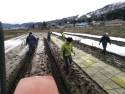 今日、先週種まきをした2,000枚の苗箱を苗間に運んでハウスを掛けました。今回は、スタッフ総出で作業に当たりました。前日まで激しい雨が降っていたので、足場がぬかるんで大変でしたが何とか予定通りに作業を終えることができました。この先一週間は穏やかな晴れの天気が続くようなので、苗の生育には心配なさそうです。よかった〜。