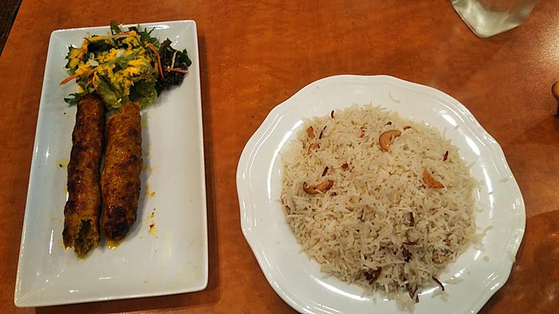 今回は、チキンシーシュケバブとギーバスマティライスと言う組み合わせです。ギーバスマティライスって何だろう? と、内容もよく解らずに注文しましたが、とても美味しいあっさり系の味付けご飯でした。帰ってから調べると、ギーと言うのはバターの一種の様です。それにナッツが入っていました。