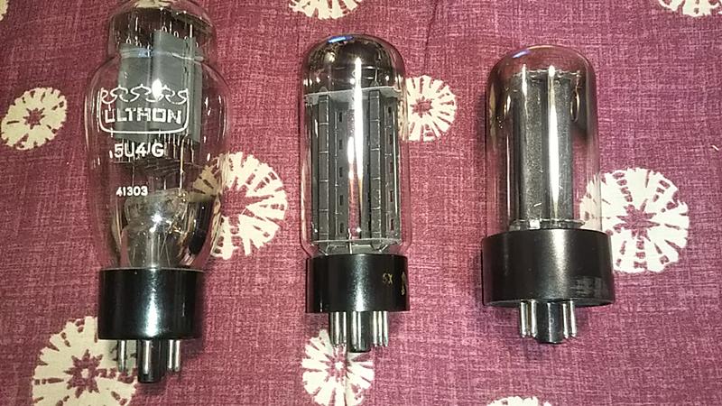 写真は整流管と言って、電源回路に使う真空管です。左から5U4G、5U4GB、5G-K18と言う型番で、外見は違いますがほぼ同じ規格と用途で、変な使い方をしない限りそのまま差し替えて使えます。左の5U4Gはドイツのウルトロン社製(実際はロシアのOEM品)の新品 中の5U4GBはNEC製、右の5G-K18は東芝製で、後の2つは捨ててあった古いテレビから回収した物です。他にも同等の物を幾つか持っています。