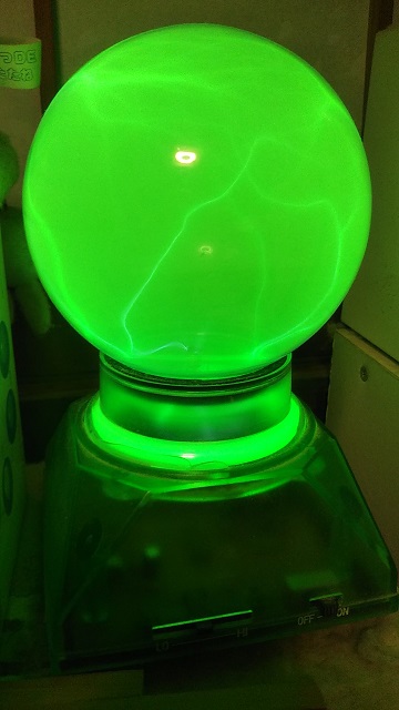 写真は20年程前に魔法用品店(嘘です、雑貨店です)で買ったガラス玉で、中で緑色の放電が動き回っていて、指を触れると、その部分に放電が集まって来ます。まるで魔法使いが水晶玉を扱っている様な感じです。