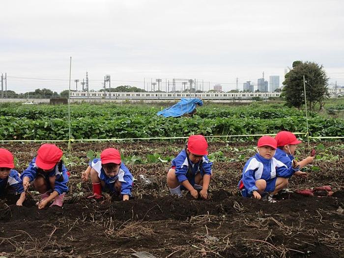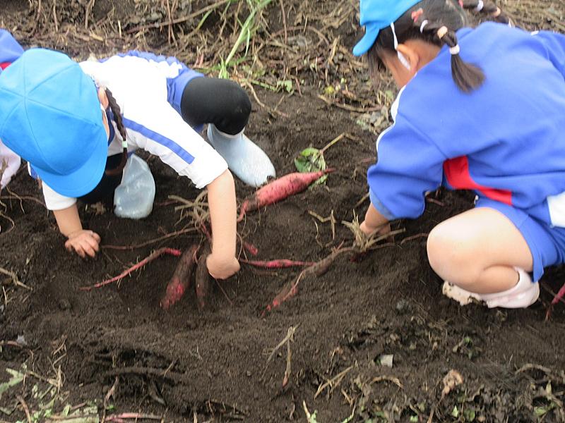 芋ほりの一日目のクラスがお芋ほりへ行ってきました。畑ではさっそく、手を泥だらけにしてせっせと掘り起こし、お芋が出てくると、歓声をあげて大喜びしていました。なかなか掘り起こすのに苦戦をしていましたが、土の感触やお芋の収穫をしっかり味わってほしいですね。