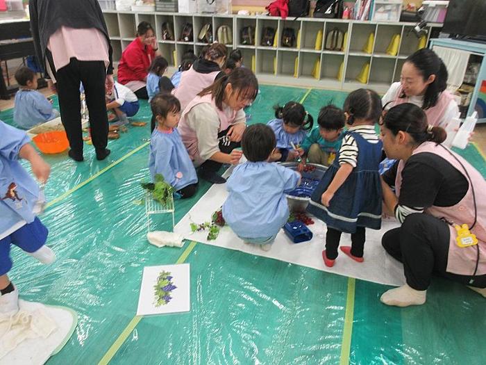 今日は園内をぐるっとひとまわり・・・、プール遊びのクラスや満3歳児つぼみ組さんと未就園児ぱんださんが面白いこと初めていましたよ。五感遊びというもので、秋をテーマにいろいろな素材の5つのコーナーで、感触を味わいながら遊びを楽しみました。みんなとっても興味を持って集中していましたよ。