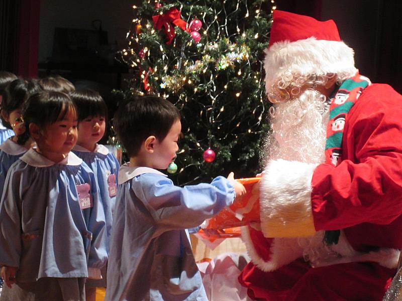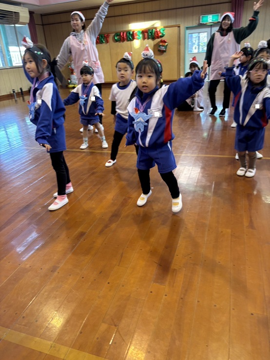 今日はクリスマス会がありました。ニコラス先生のサンタさんとダンスをしたり、先生たちのベルの演奏と歌声が鳴り響き、ちょっと早いクリスマス会を楽しみました。