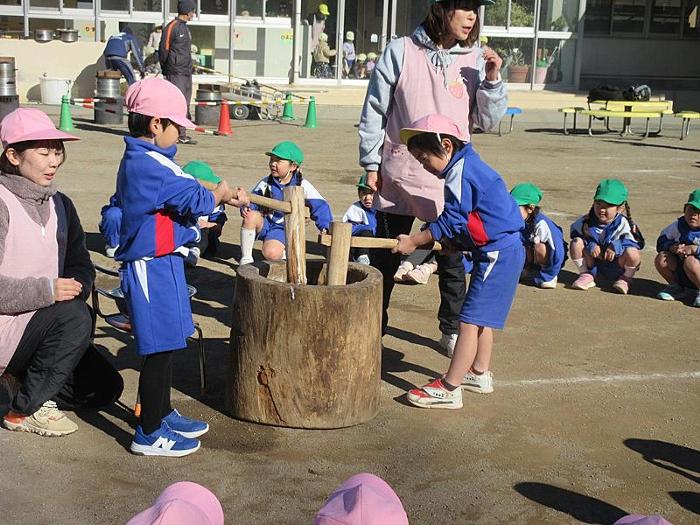 さあ今度はみんなの番です。小さな杵でつく体験をしました。もち米からお餅になる様子、興味はつきませんね。年長組はお供え餅も、今年は、小さくちぎってほんの少しですが、甘醤油で年長のみ食べました。