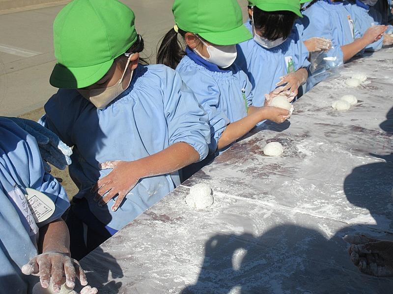 今日はもちつき会を行いました。風の強い日になり、かまどの火付けに苦労しましたが、何とか間に合ってほっと一息! まずは恒例の男性の先生が大きな杵でつくところをみんなで応援「よいしょい!よいしょ!」と園庭が一気ににぎやかに。