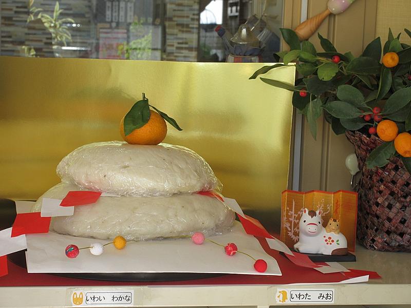先日、みんながついてくれたお餅を使って大きなお供え餅を作りました。やっと固くなって、冬休み前に見てもらおうと飾りましたが、ちょっと平でしたね。