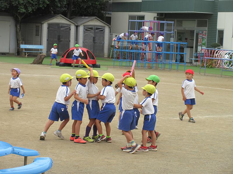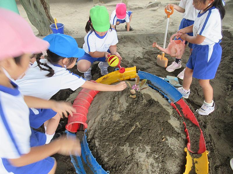 子どもたちは、それぞれの思いを持って、走れたこと頑張れたこと、少しずつ自信となって張りきる姿も見られます。今日も自分たちからチームを作ってリレーで遊ぶ姿がありました。自分たちでやってみようとする気持ちを大切にしてあげたいと思います。砂場では異年齢でダムづくり盛り上がっていましたよ。