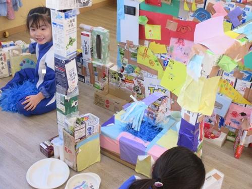 4歳児クラスの家づくりが続いています。日々さまざまな物が出来てきて、エアコンがついていました。ひらひらが何とも・・・。エアコン売り場みたいですね。リモコンもあるようで、子どもたちの観る力や、発想が実におもしろいなと感じます。子どもたちの遊びは次から次へと広がっていきます。こんな遊びを大事にしてあげたいと思います。手作り凧揚げもでてきましたよ。